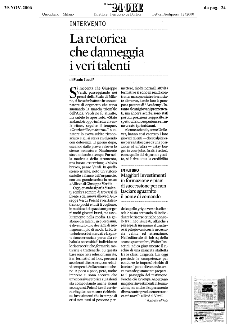 A complemento di quanto sostiene Nicola Rossi c’è anche il rischio che la questione dei talenti diventi un boomerang, come ricorda anche Paolo Iacci in questo articolo che ho ritrovato in una vecchia rassegna stampa, stravolgendo così il valore delle differenze. In entrambi i casi i due autori concordano su un punto: per valorizzare il talento non basta “guardare alla media” ma servono politiche mirate e – come dice Rossi – segni tangibili di una discontinuità tra “leadership” e “monopoli”, due elementi uniti il più delle volte in una pericolosa miscela che identifica il valore di chi ha potere [non soltanto politico, ma in generale all’interno di ogni struttura organizzativa, incluse le imprese] con i meccanismi e le regole per mantenerlo.